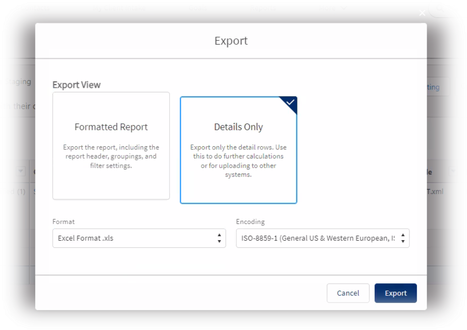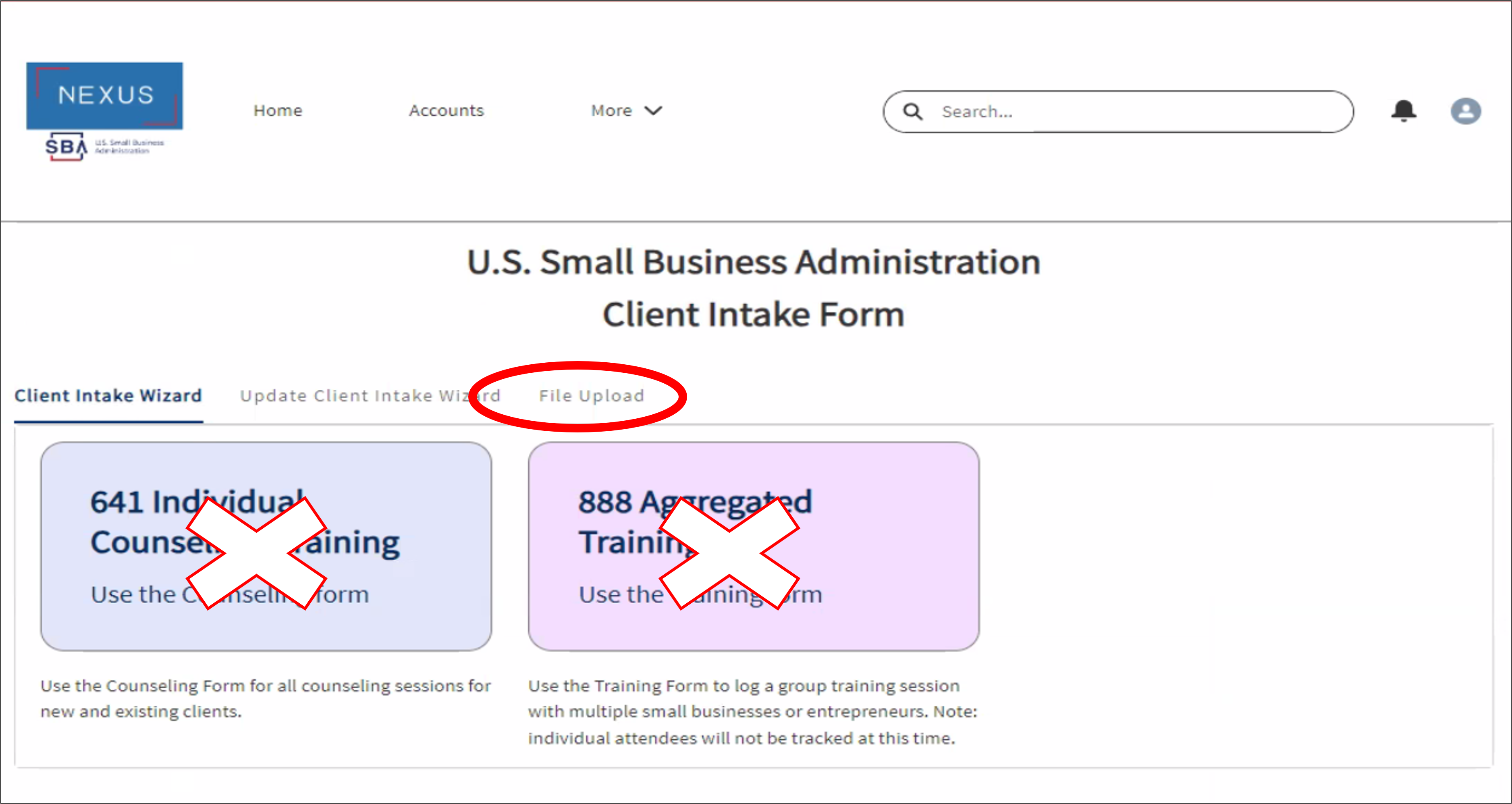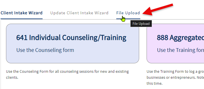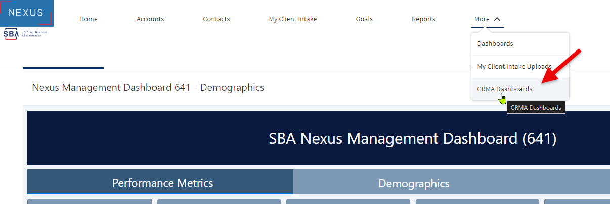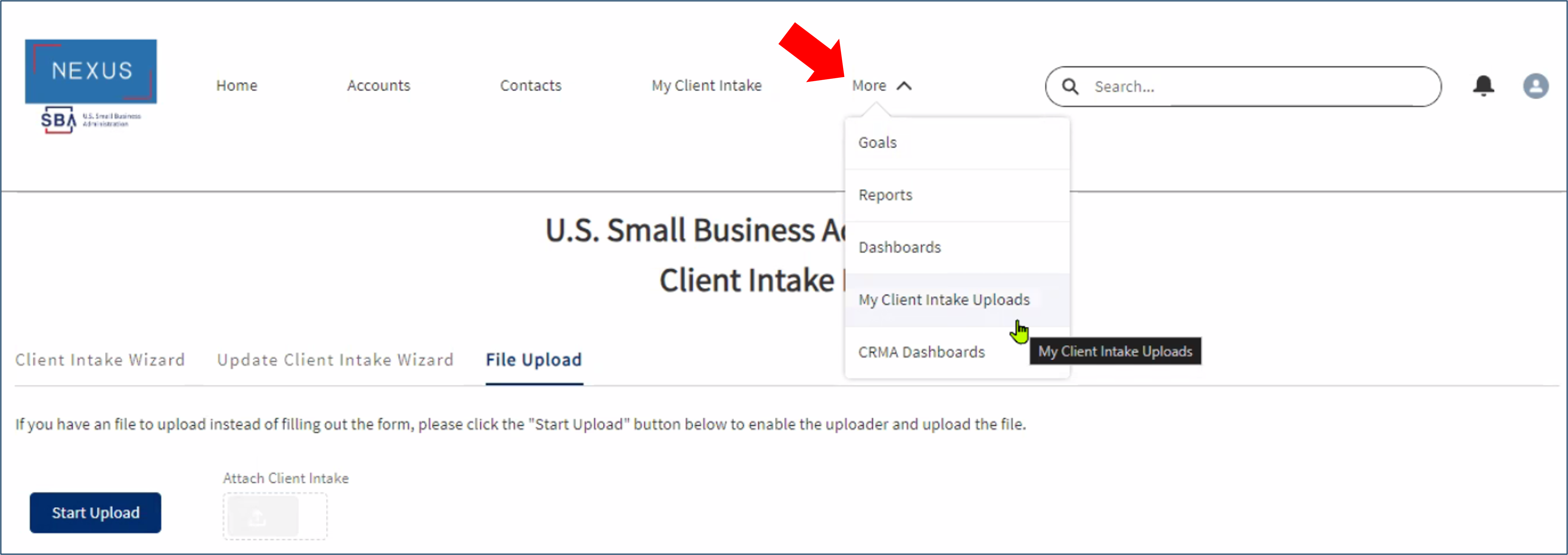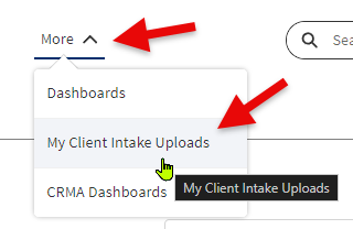 a screen capture of the File Upload page accessing the More menu with options listed for Goals and Reports and Dashboards and My Client Intake Uploads and CRMA Dashboards