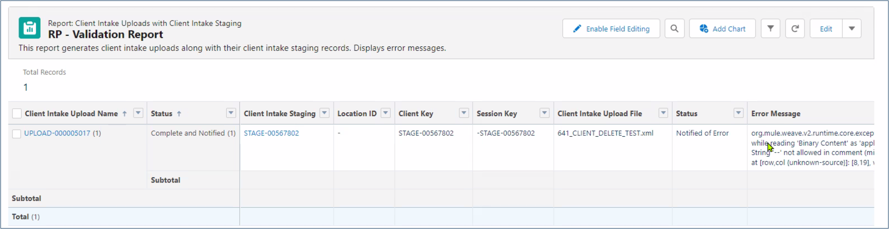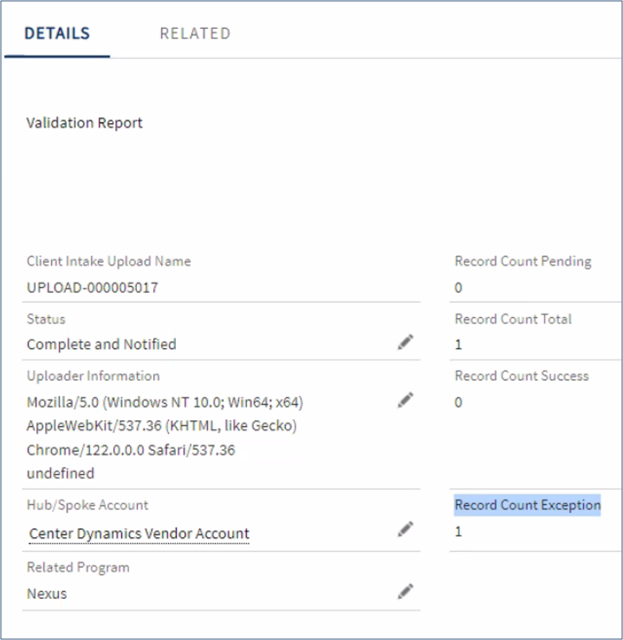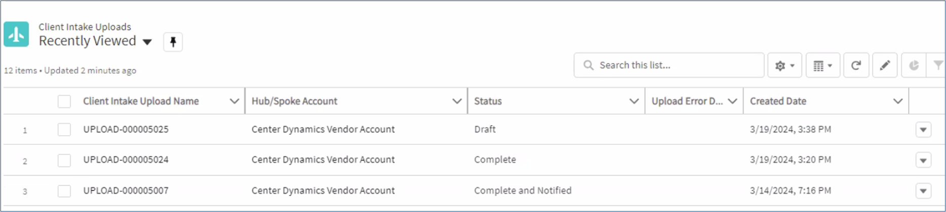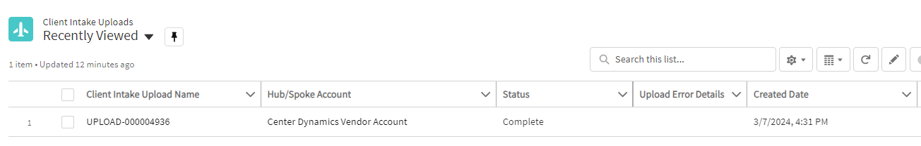a screen capture of the Client Intake Uploads Recently Viewed files screen that lists the Nexus name for each file along with the upload status and date created