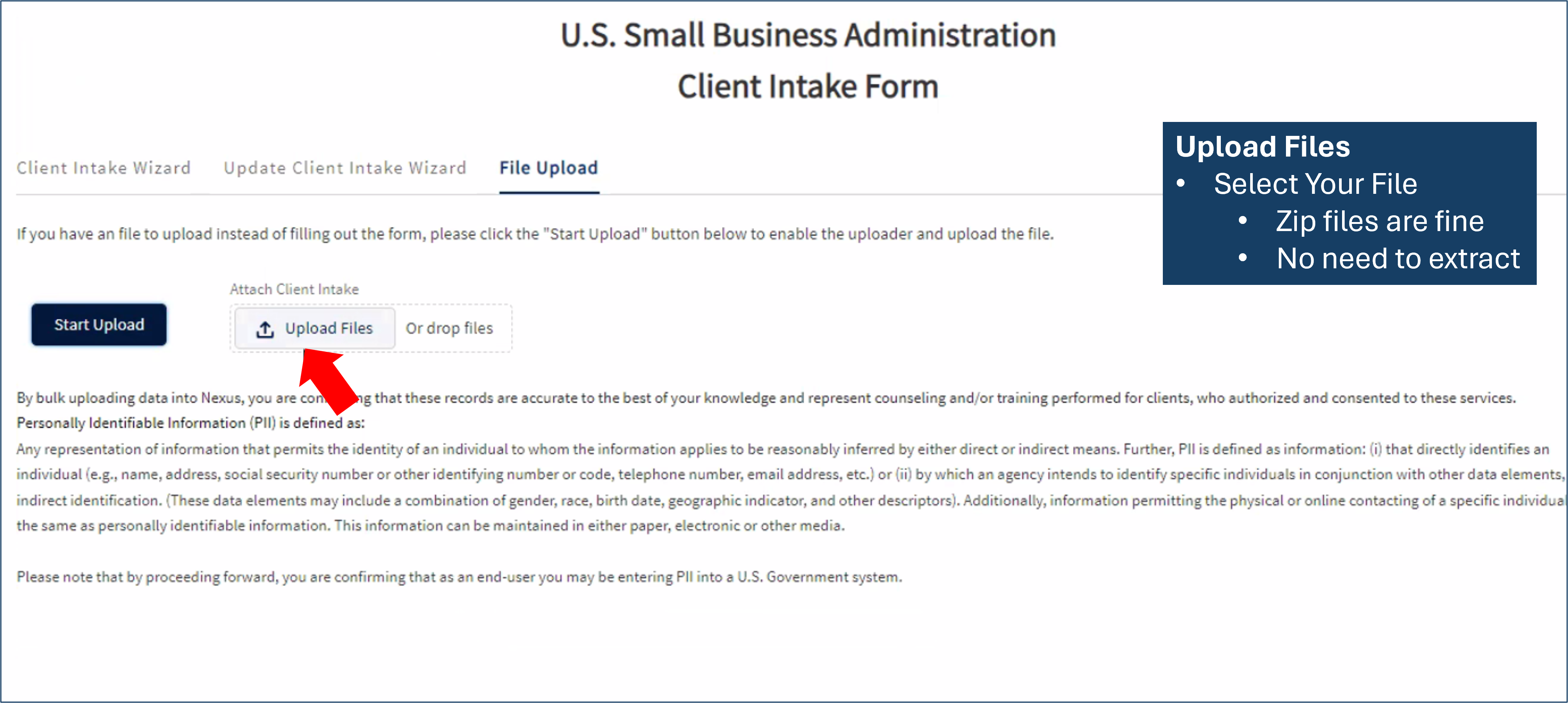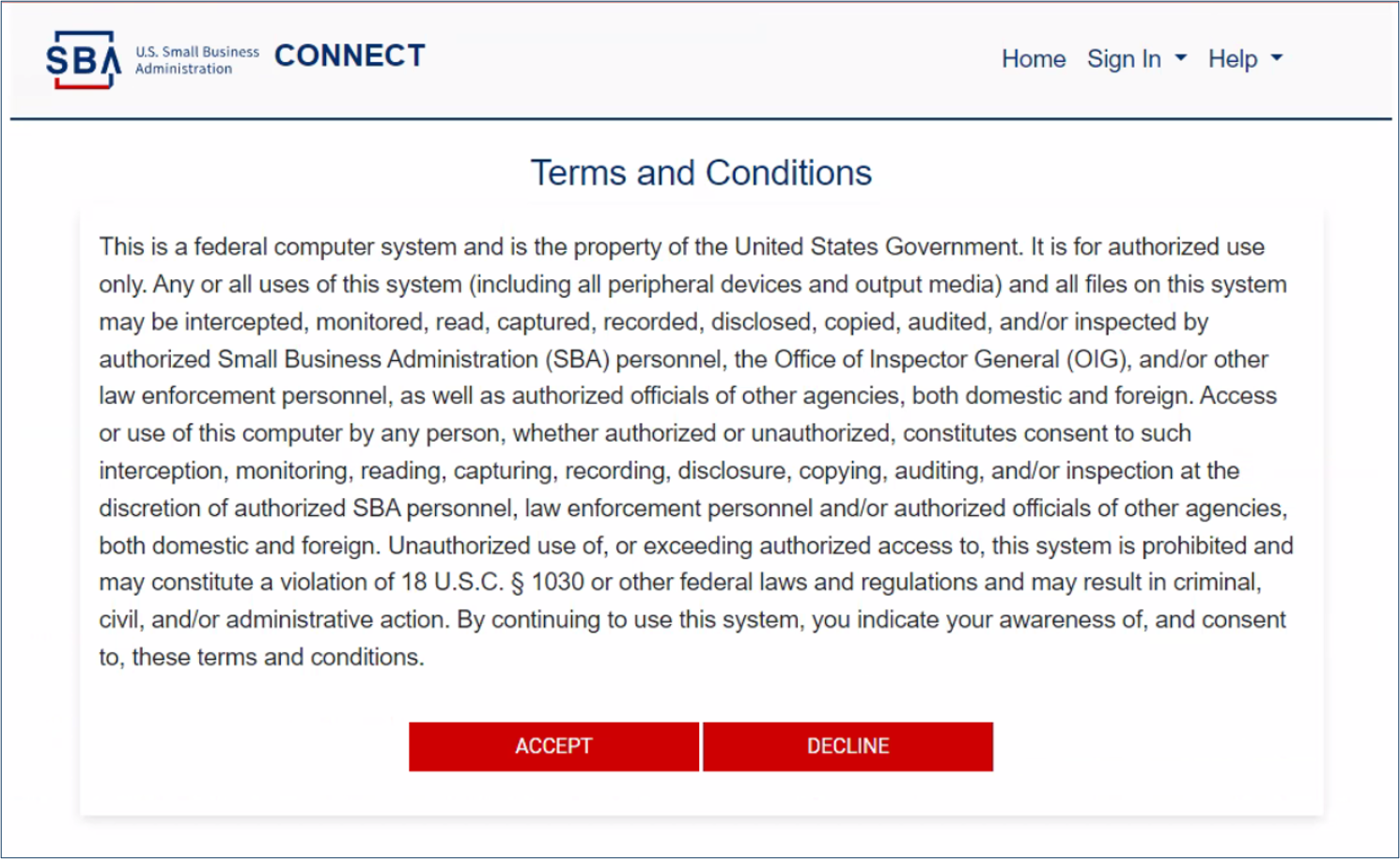 a screen capture of the terms and conditions for accessing US Government data system actual site available at https://connect.sba.gov/Home/LoginExternal