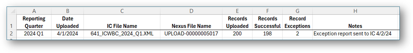 a screen capture of an Excel worksheet including columns for Reporting Quarter and Date Uploaded and IC File Name and Nexus File Name and Records Uploaded and Successful and Exceptions as well as a column for Notes